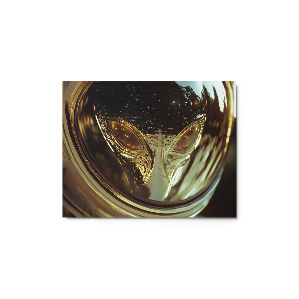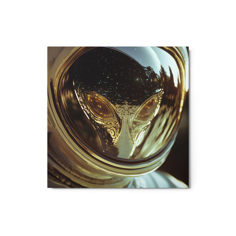 Immerse yourself in the enigma of the unknown with Alien Reflection, a glossy metal print that blurs the line between human exploration and extraterrestrial mystery. Featuring the haunting gaze of an alien presence shimmering across a golden visor, this artwork radiates otherworldly power and cosmic intrigue. 🌌🚀