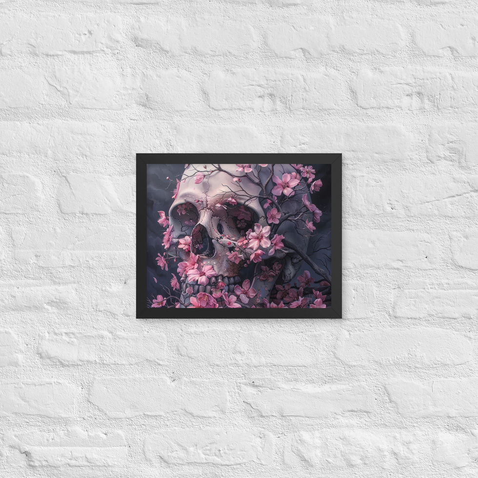 Make a statement with Ashen Bloom on a framed poster. The image of cracked bone wrapped in cherry blossoms offers a striking play of life and stillness, protected beneath a sleek acrylic pane.