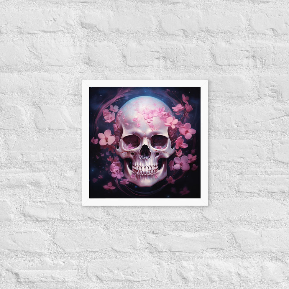 Make a bold statement with Astral Rebirth on a framed poster. The luminous skull entwined with blossoms drifts through space, perfectly preserved behind a sleek protective frame.