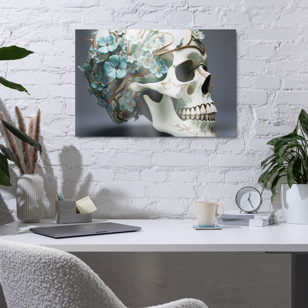 Transform your space with the Azure Blossom Skull metal print, a striking blend of turquoise flowers and golden vines cascading over a beautifully detailed skull. This bold and sophisticated artwork is perfect for adding a modern edge to your home or office décor. 🌸✨
