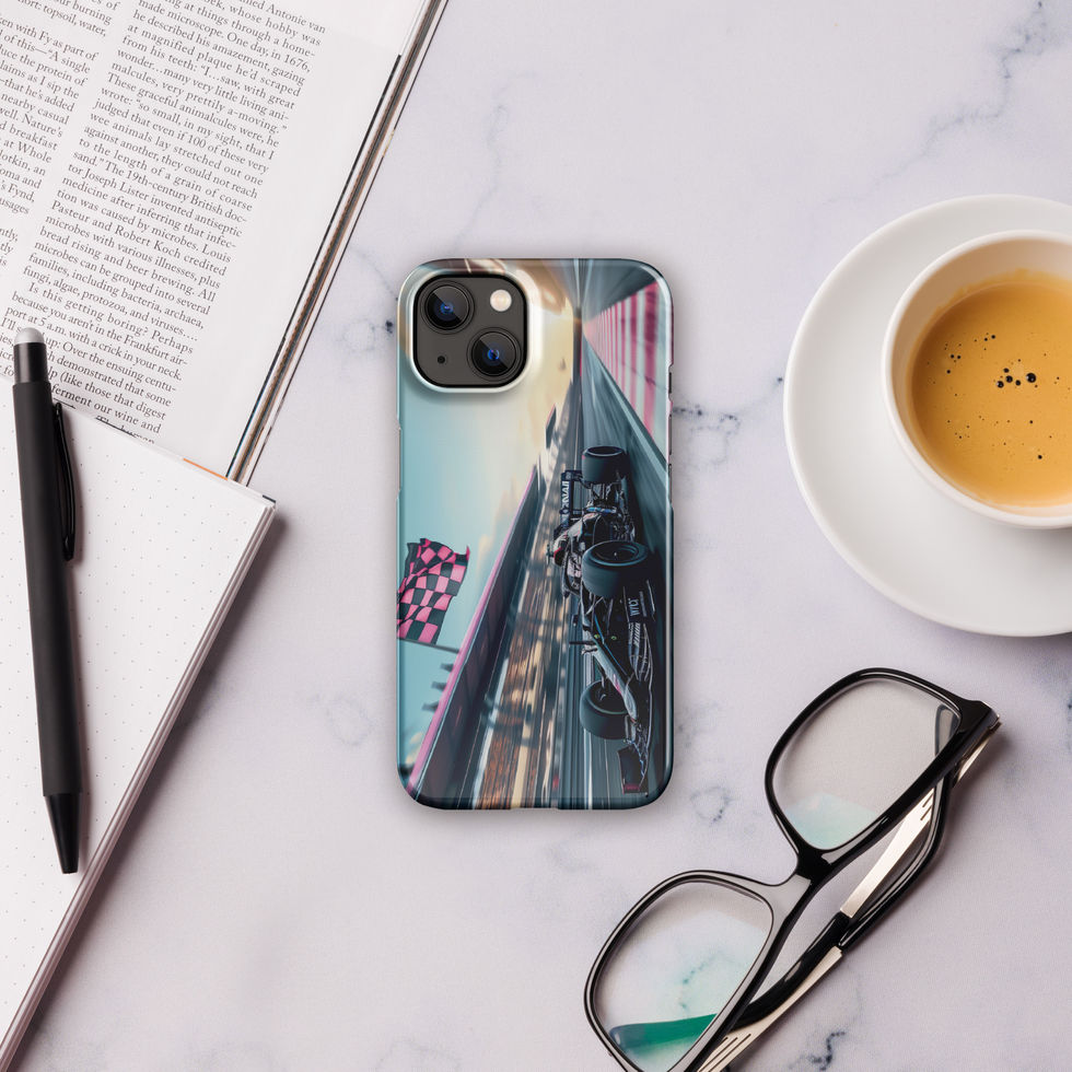 Celebrate the pinnacle of speed and precision with the Blackout Champion Snap Case for iPhone®! This exhilarating design captures a sleek black Formula 1 car tearing past the finish line under the golden sunset. The motion-blurred grandstands, streaks of pink and black, and the waving checkered flag create a dynamic sense of movement, making this case a must-have for racing enthusiasts who crave the thrill of victory. 🏁🌅