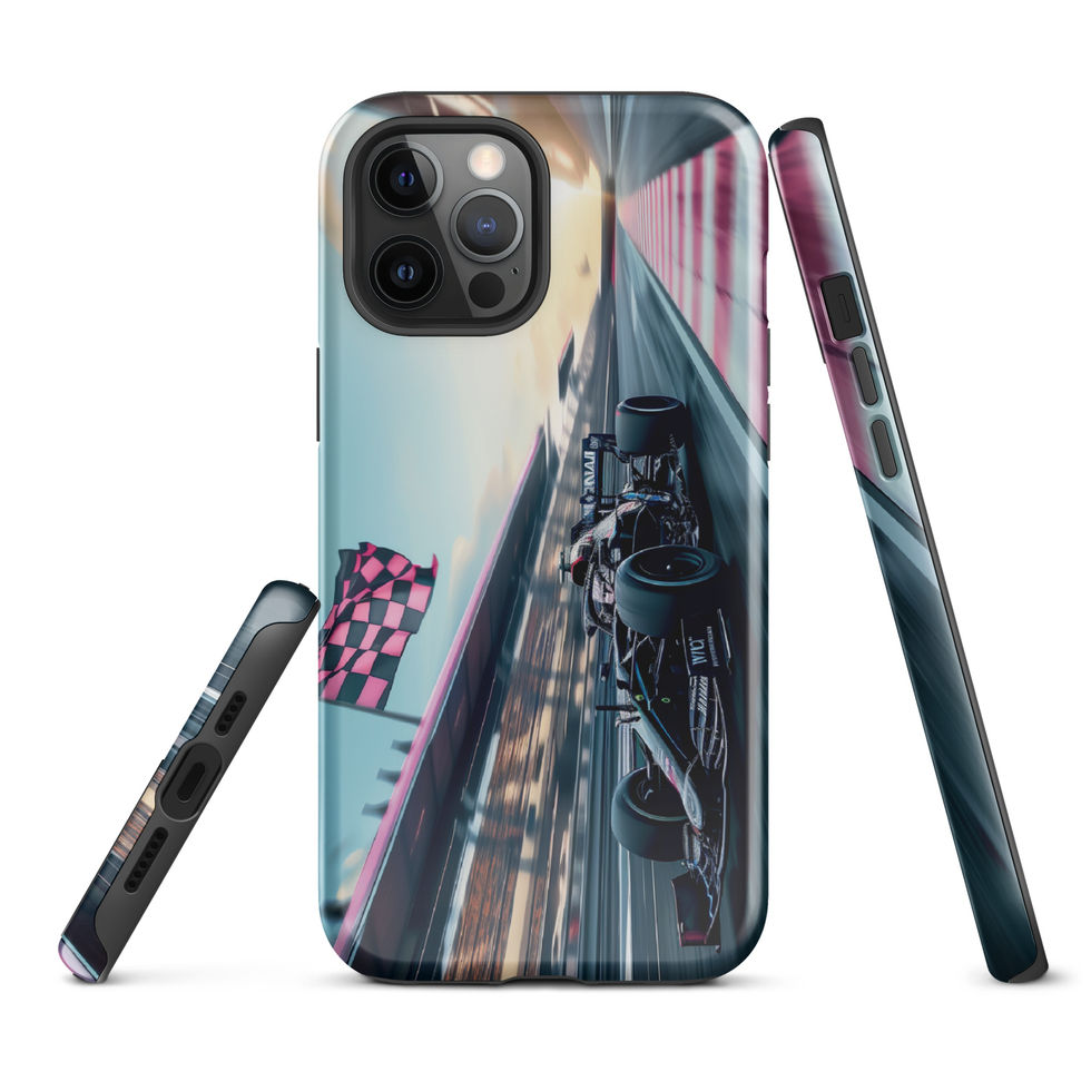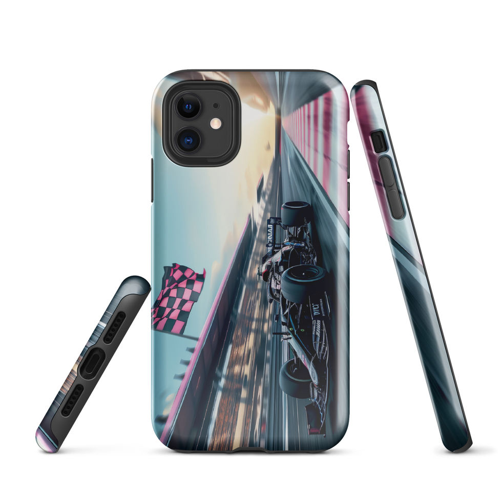 Unleash the power of motorsport with the Blackout Champion Tough Case for iPhone®! This case showcases an F1 car crossing the finish line at top speed, its matte black body reflecting the golden light of the final lap. The dramatic motion blur and high-speed intensity make this design a true standout. Engineered for durability and style, this case offers unbeatable protection without sacrificing its sleek racing aesthetic. 🏁🔥