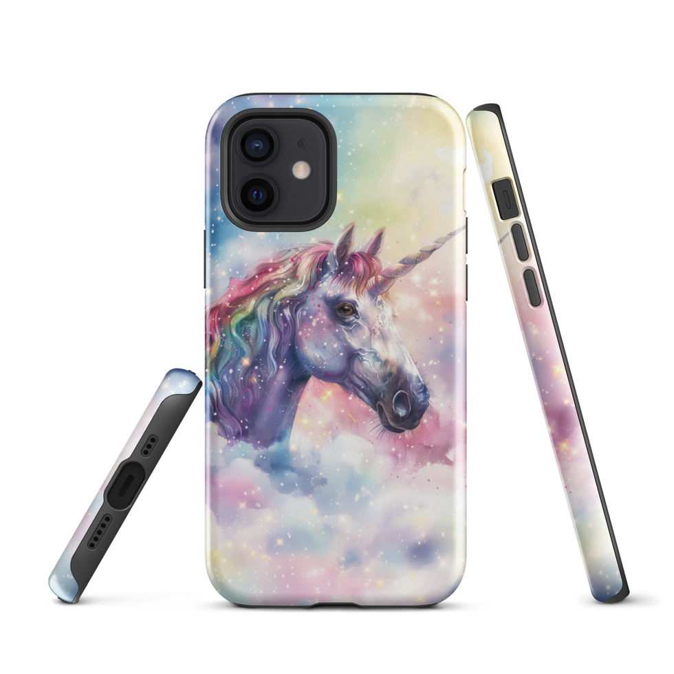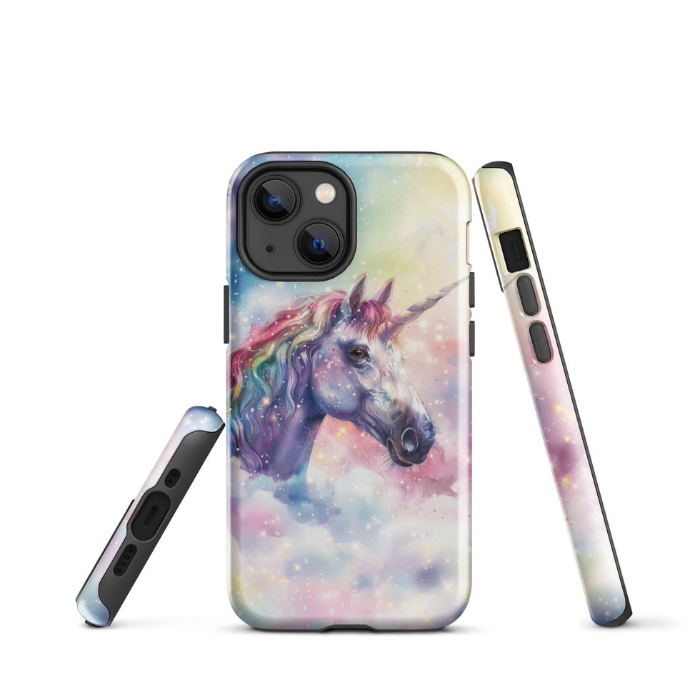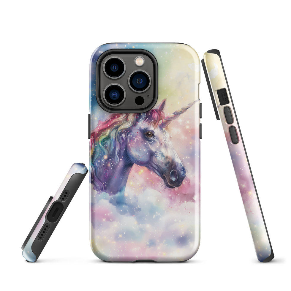 Step into a world of wonder with the Celestial Dreamscape Tough Case for iPhone®! Featuring a breathtaking unicorn emerging from a mist of cosmic clouds, this case blends fantasy and elegance effortlessly. The pastel hues and twinkling stardust create a magical aura, making your phone shine with celestial charm. 🌈🌠