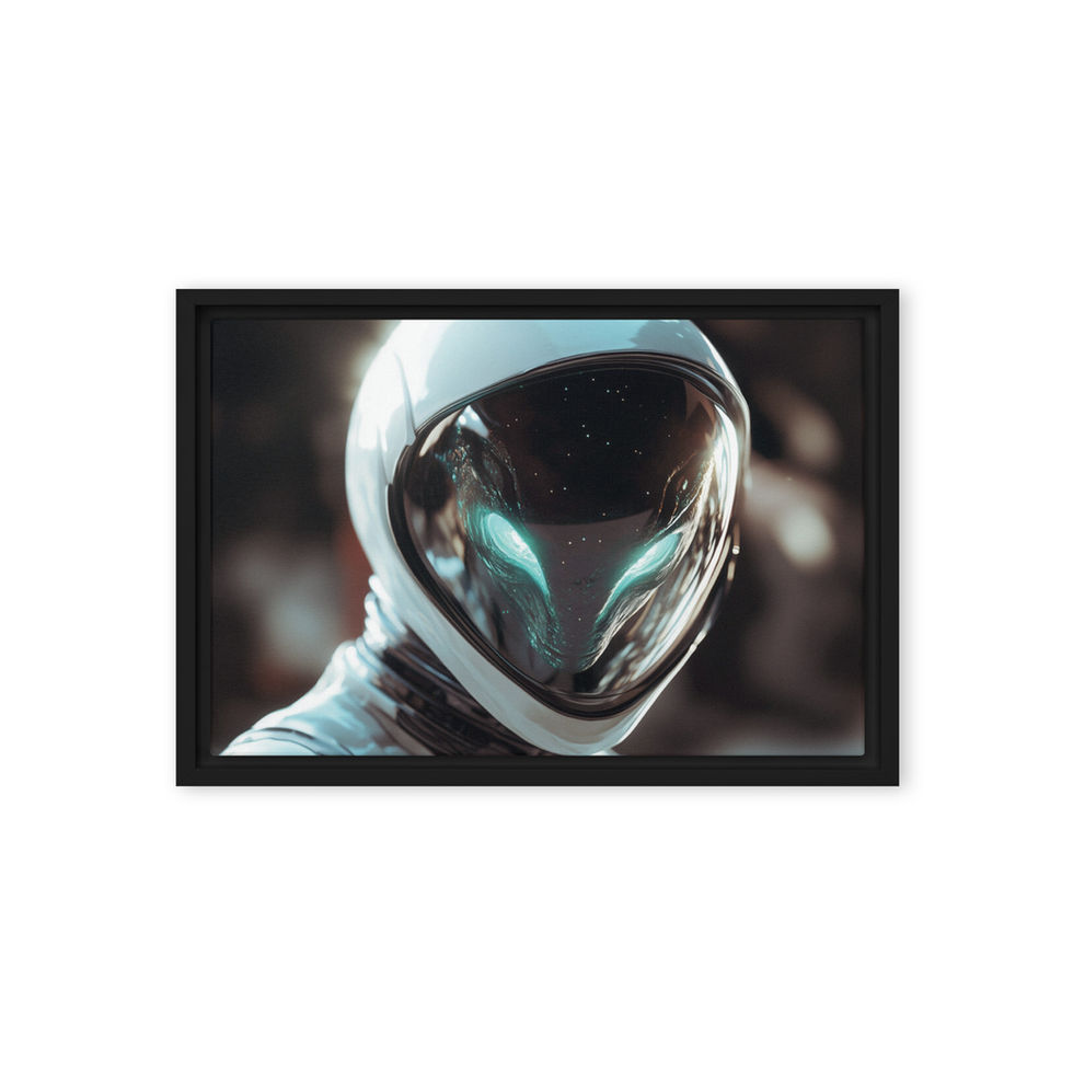 Unleash your imagination with this sleek and captivating artwork "Celestial Sentinel" Futuristic Artwork Framed Canvas, featuring a futuristic astronaut helmet reflecting the glowing, ethereal gaze of an alien entity. The blend of cutting-edge design and cosmic mystery creates a compelling visual that bridges the gap between humanity and the unknown.