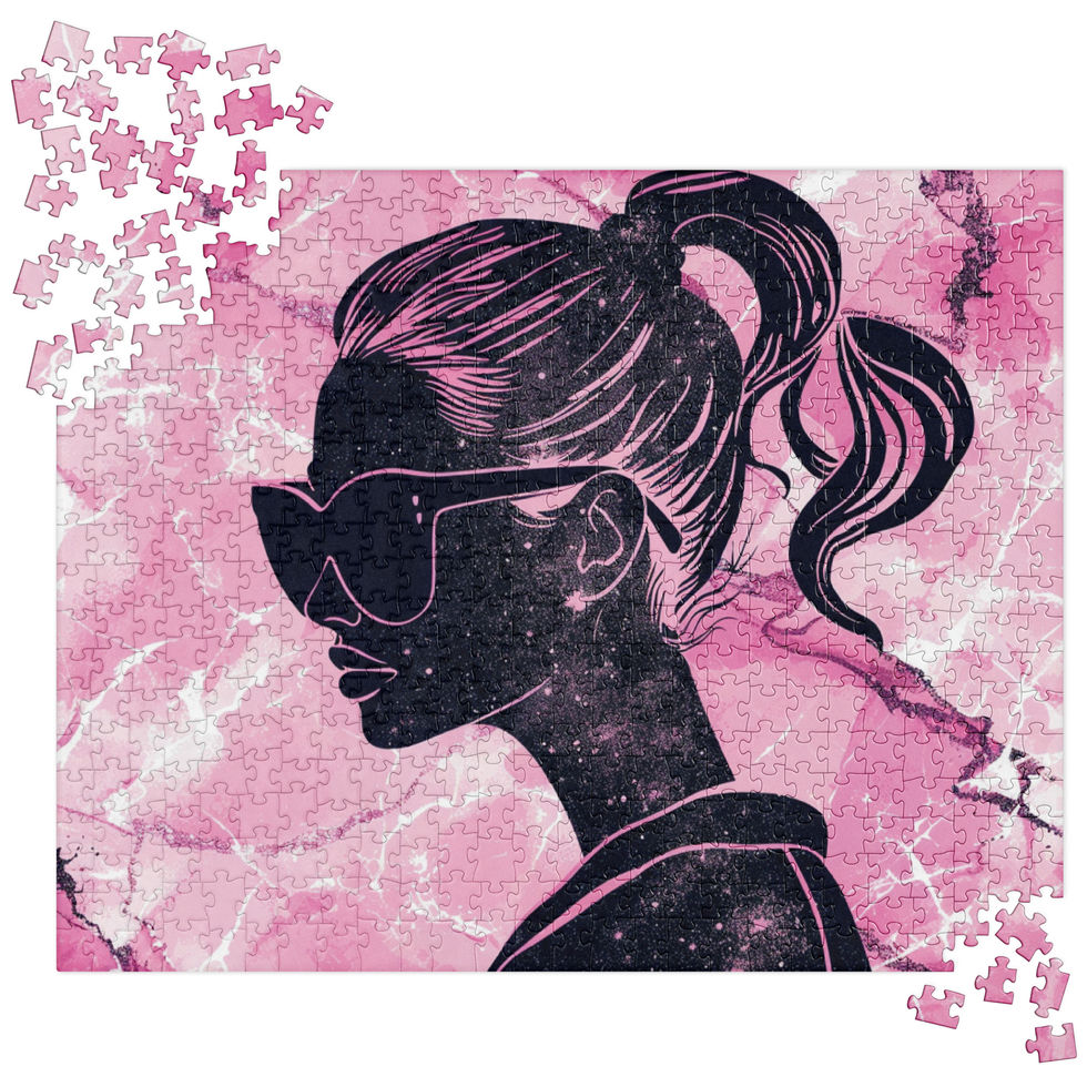 Unleash your inner fashionista with the "Chic Chick" jigsaw puzzle! Featuring a striking silhouette of a confident woman in oversized sunglasses against a cosmic pink marble backdrop, this puzzle exudes style, elegance, and mystery. 💖✨