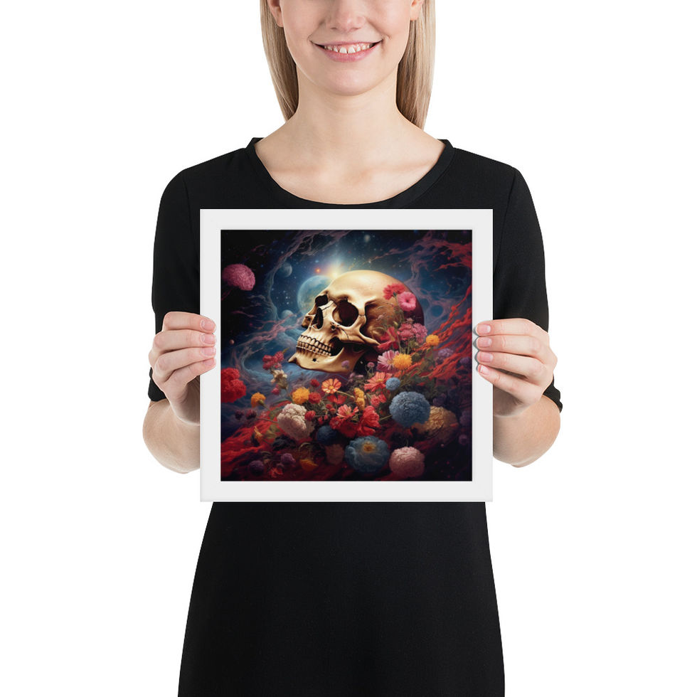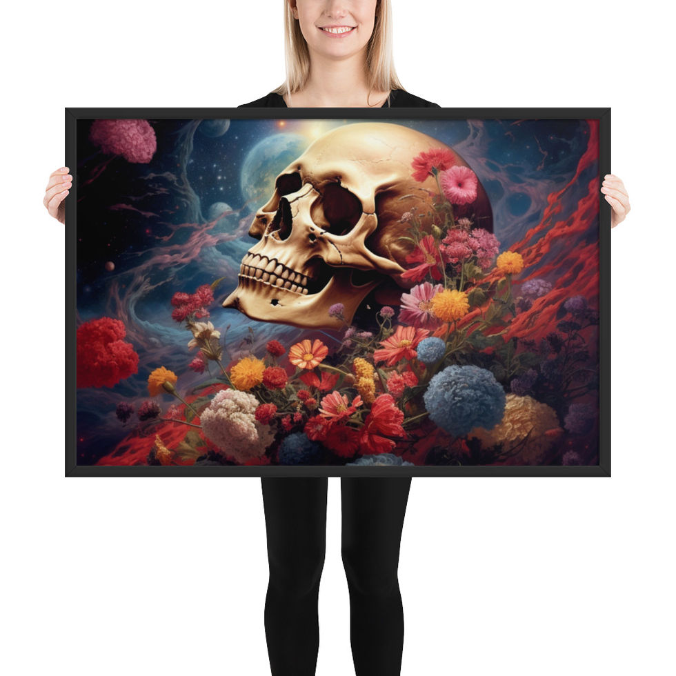 Transform your walls with the Cosmic Bloom Skull framed poster—a masterpiece of timeless elegance and cosmic charm. 🌌💀 Order yours today!