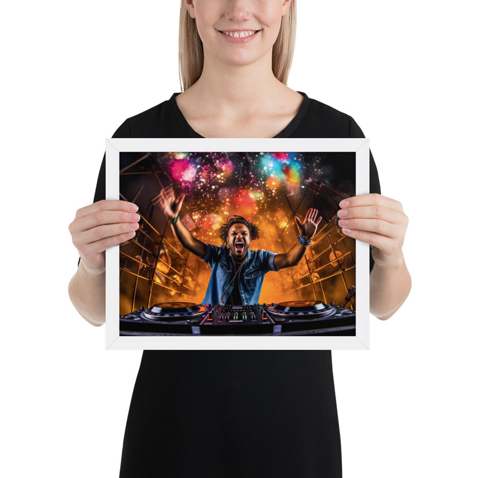 Turn up the energy in your space with the Cosmic Drop Framed Poster! This electrifying artwork captures a DJ in the middle of an epic drop, arms raised as cosmic lights explode around him, bringing the pulse of live music to life. Professionally framed for a sleek and polished look, this piece is perfect for music lovers, DJs, and festival-goers who thrive on rhythm, colour, and movement.