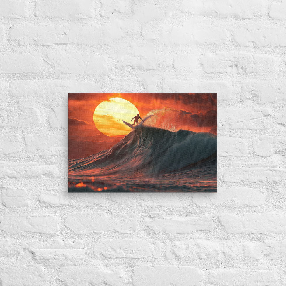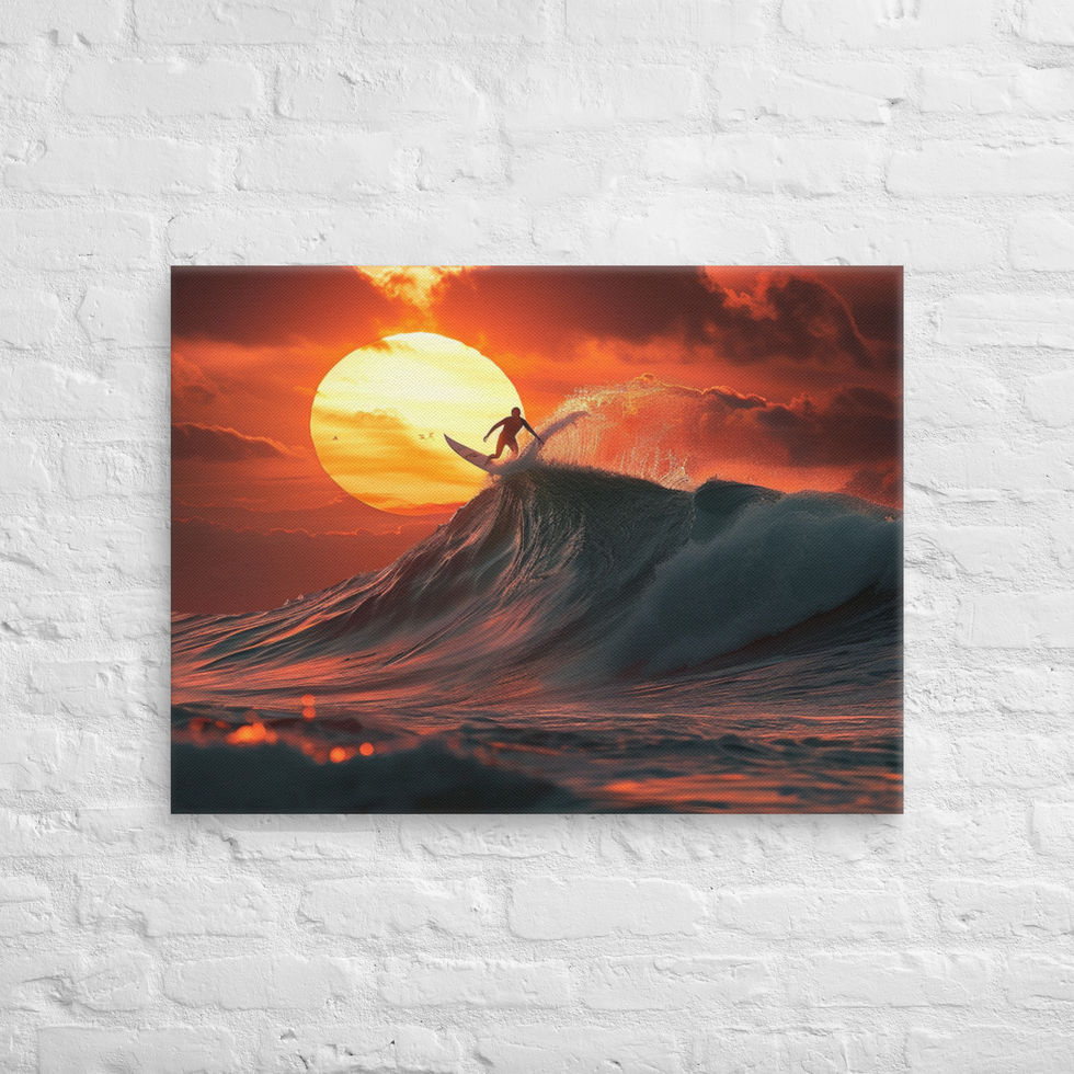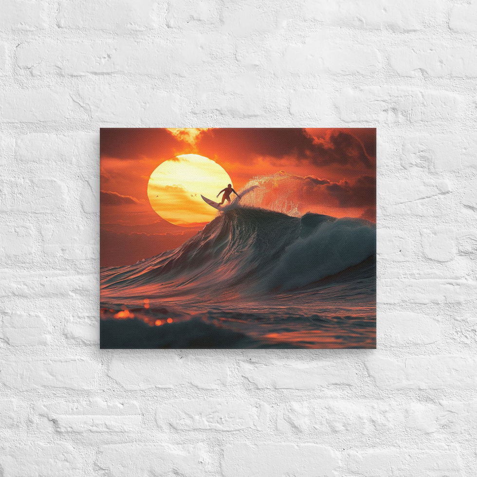 Immerse yourself in the passion of the sea with Crimson Wave as a canvas print. This stunning piece captures the fiery dance of ocean waves and a surfer silhouetted against the blazing sun.