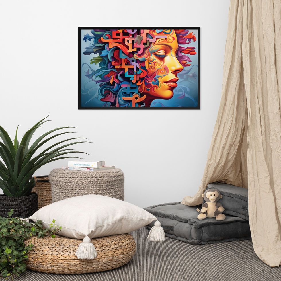 Elevate your space with "Dreamweaver's Mind", a mesmerizing framed poster that blends surrealism with intricate abstraction. Featuring a vivid female portrait seamlessly interwoven with swirling patterns and puzzle-like elements, this artwork symbolizes creativity, imagination, and the limitless potential of thought. A visually striking and thought-provoking statement piece perfect for any modern setting. ✨🧩🧠