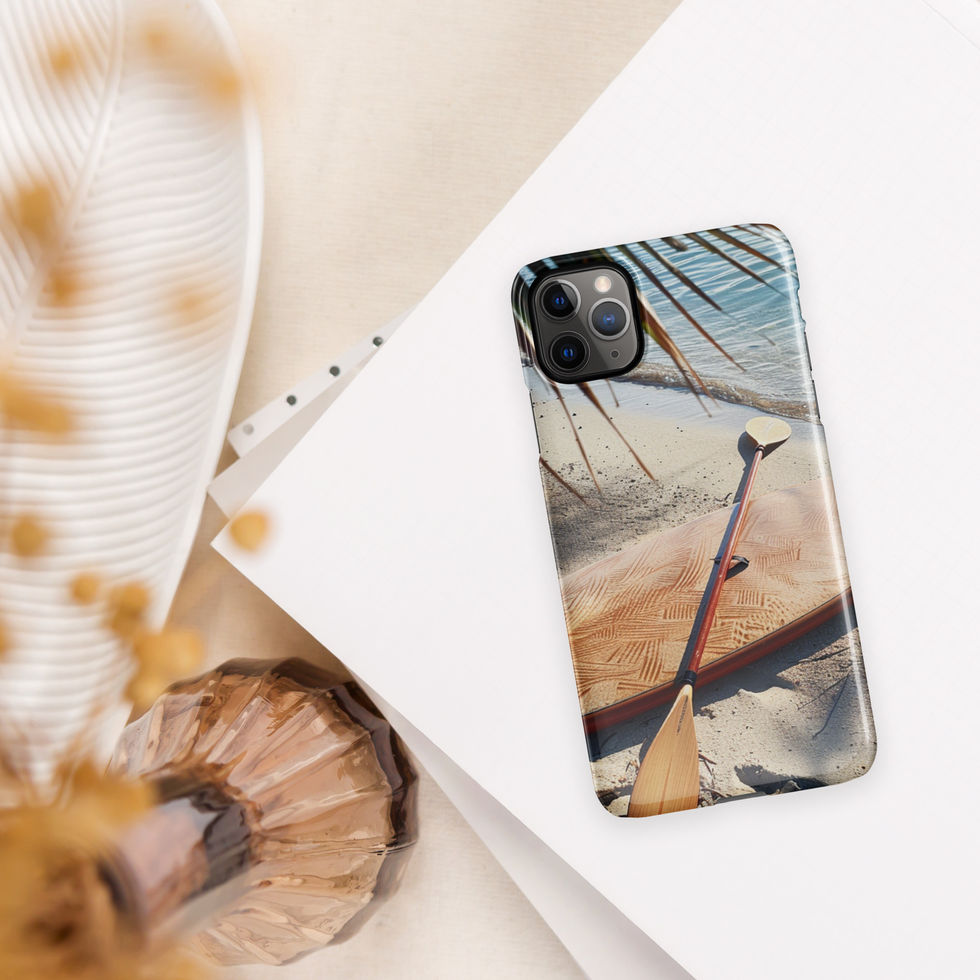 Embrace the beauty of coastal serenity with the "Driftwood Escape" Snap Case. This tranquil design showcases a beautifully textured wooden paddleboard resting gently on golden sand, with a sleek wooden paddle lying across it. The soft waves lap at the shore, glistening under the sun, while palm fronds cast dappled shadows over the scene. Perfect for ocean lovers and adventure seekers, this case embodies the peaceful yet exhilarating spirit of the sea. 🌊🏄♂️✨