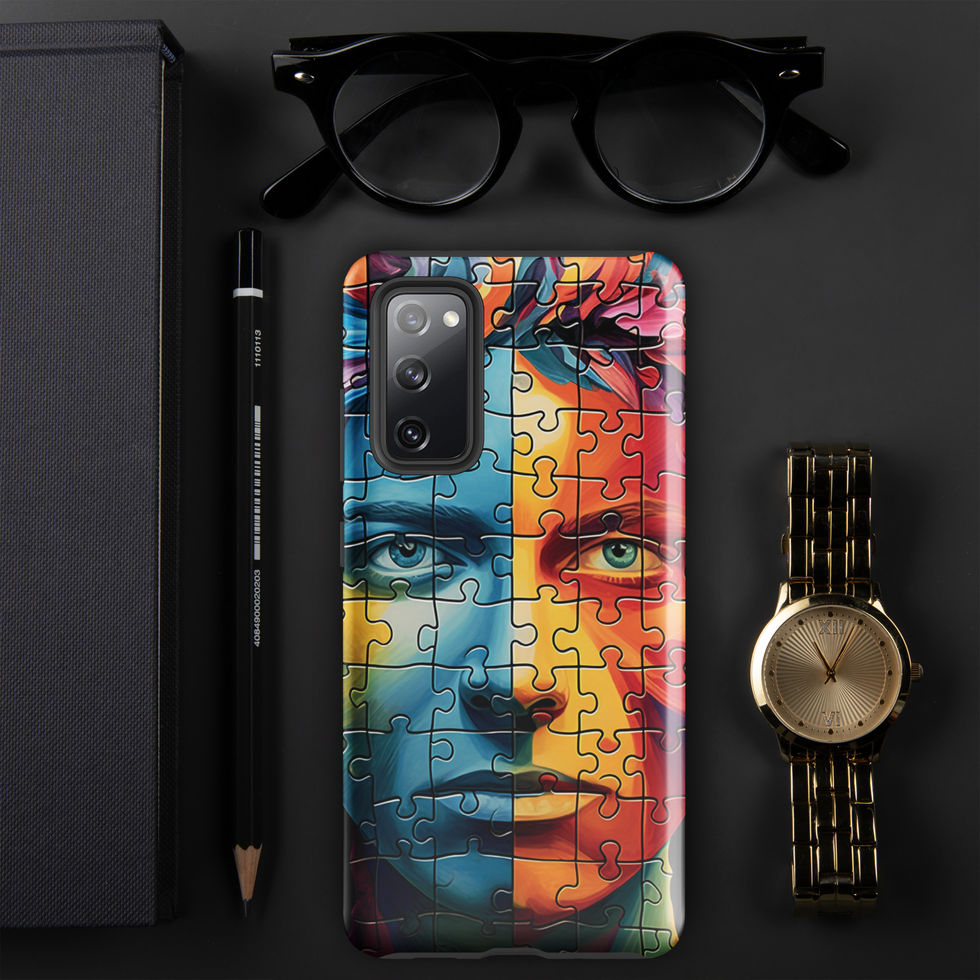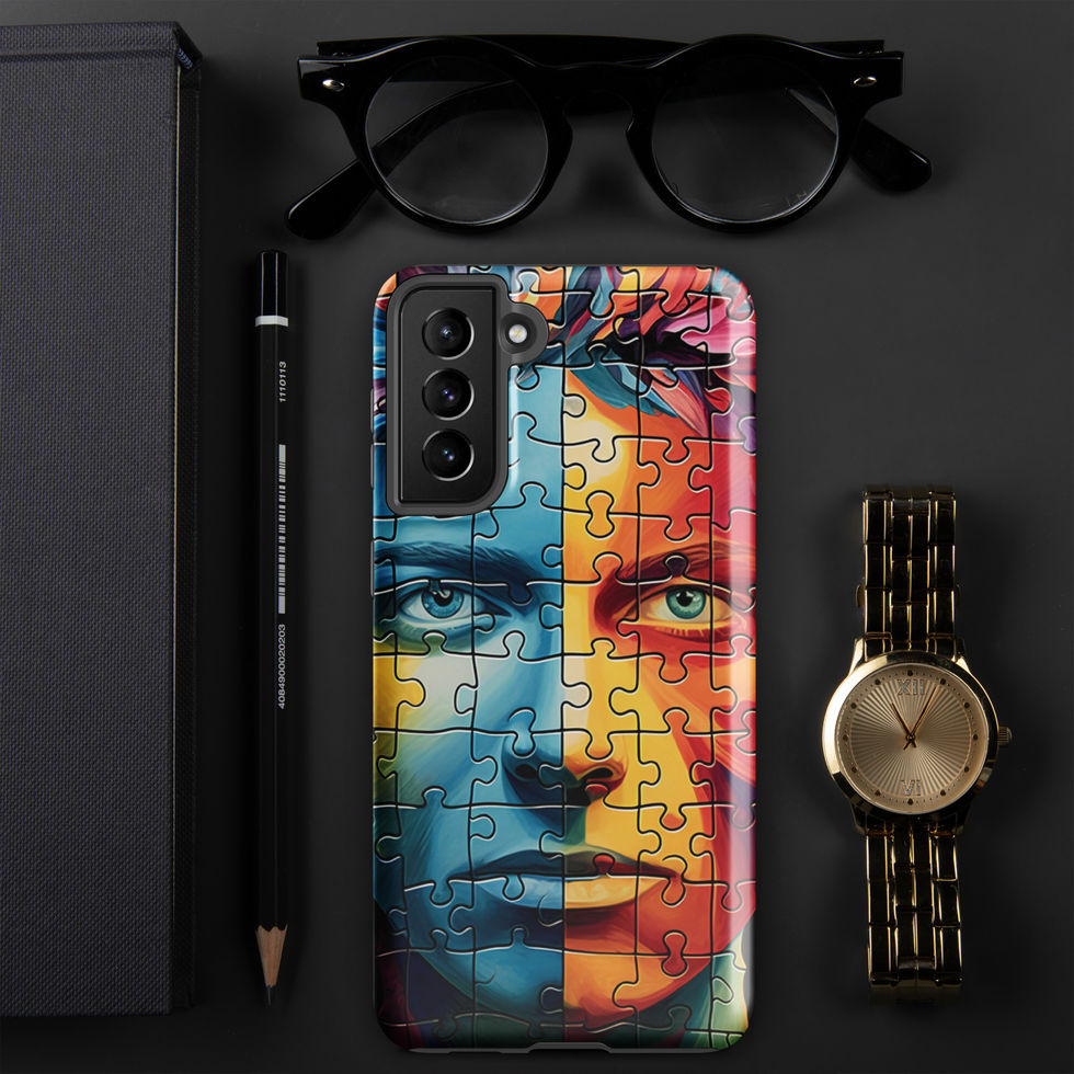 Turn your Samsung into a masterpiece of contrast with the "Duality Unraveled" tough case! This visually gripping artwork presents a face split into two opposing halves�one side awash in fiery oranges and yellows, the other submerged in cool, serene blues. The puzzle pieces that form the portrait give a sense of fluid transformation, suggesting that we are never truly complete, always evolving. Whether you resonate with fire, ice, or both, this case embodies the tension and harmony between light and dark, chaos and order. ??????