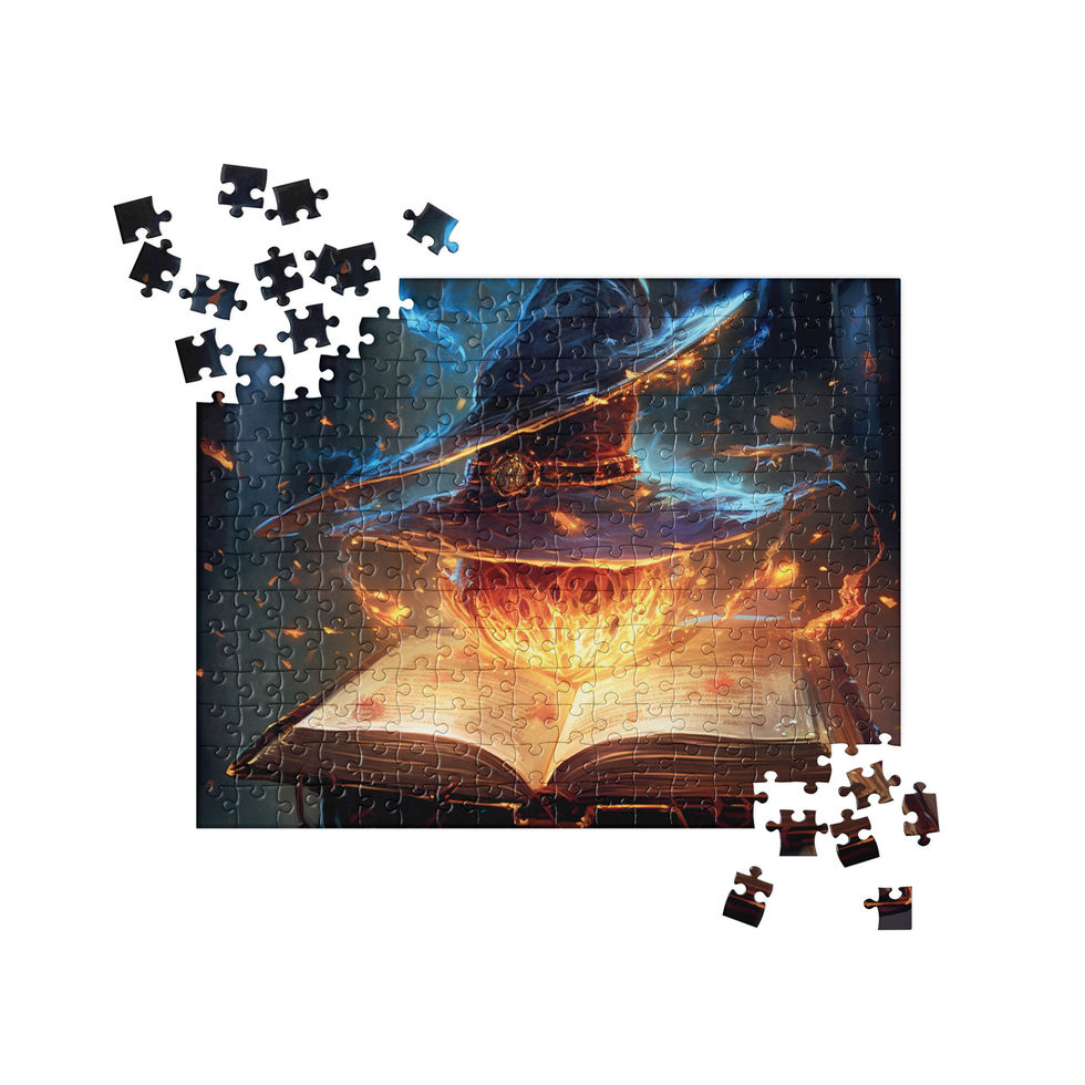 Unravel the mysteries of Enchanted Knowledge, a captivating jigsaw puzzle featuring a mystical wizard’s hat levitating over an ancient, spellbound book. Fiery embers and arcane energy swirl around, bringing a touch of magic to every piece. Whether you're a fantasy enthusiast or a puzzle lover, this enchanting artwork will challenge and delight as you piece together its magical essence.