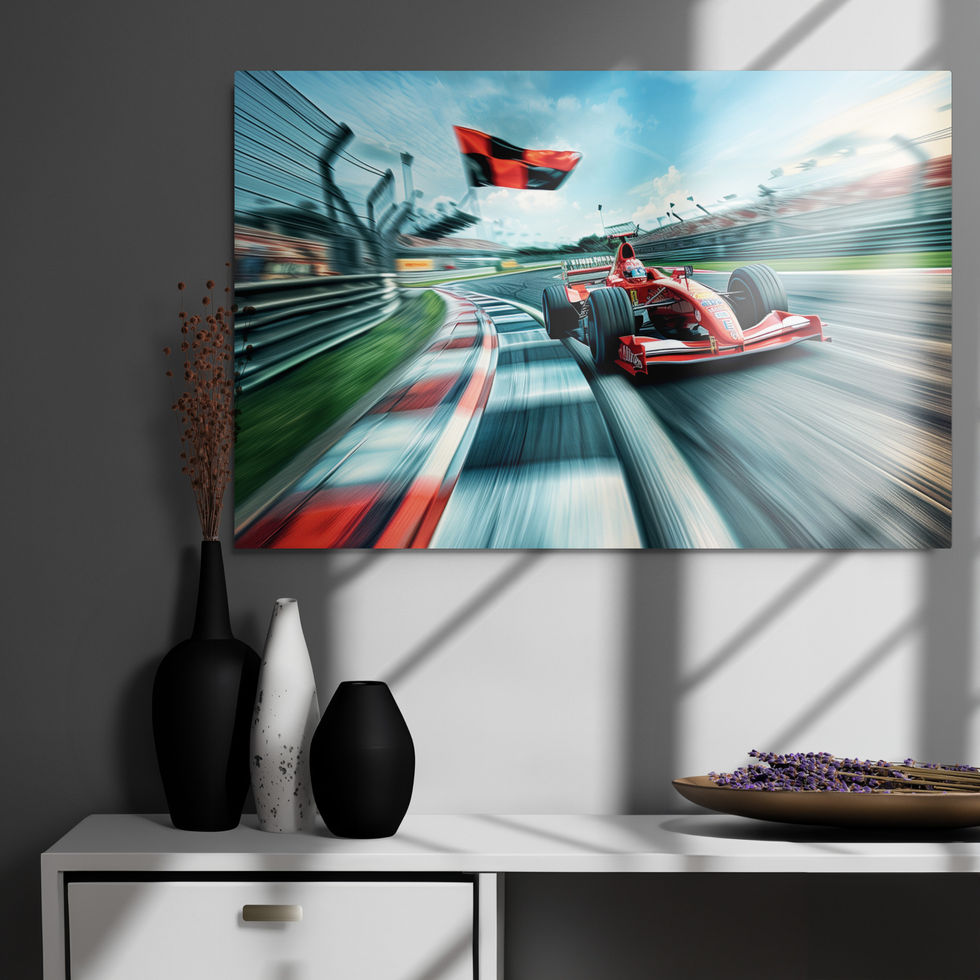 Transform your space with the high-octane energy of the "F1 Circuit Victory" metal print. Featuring a fiery red Formula 1 car navigating a sharp turn as the checkered flag waves in the distance, this stunning artwork captures the speed, precision, and excitement of the racetrack. 🌟🏁