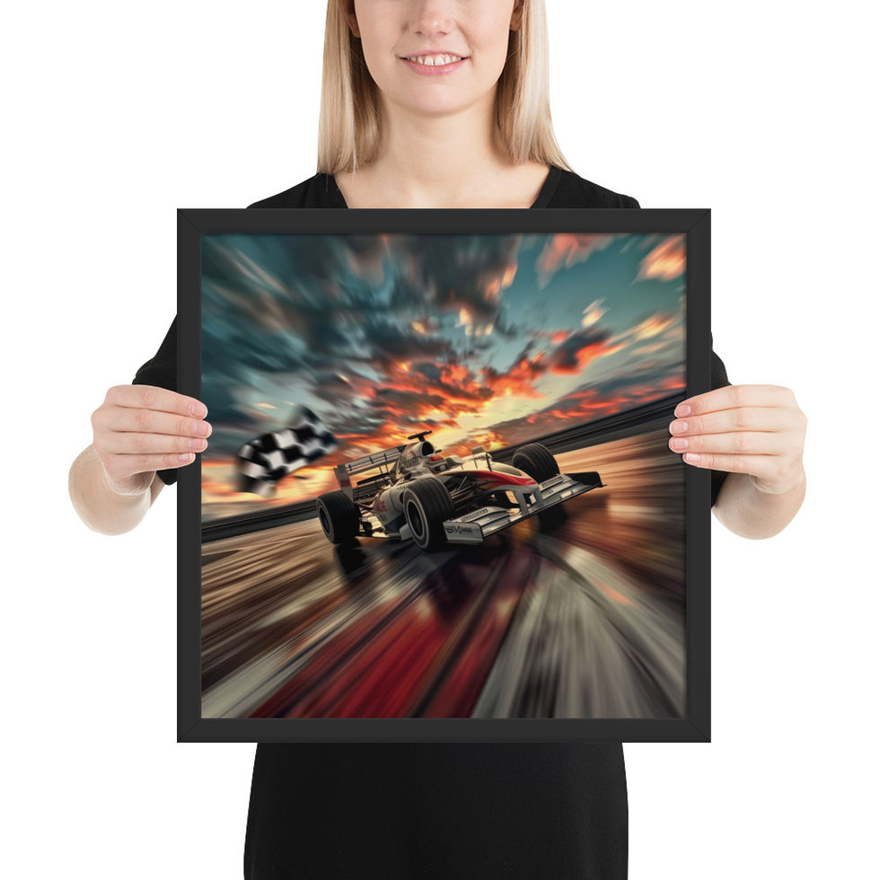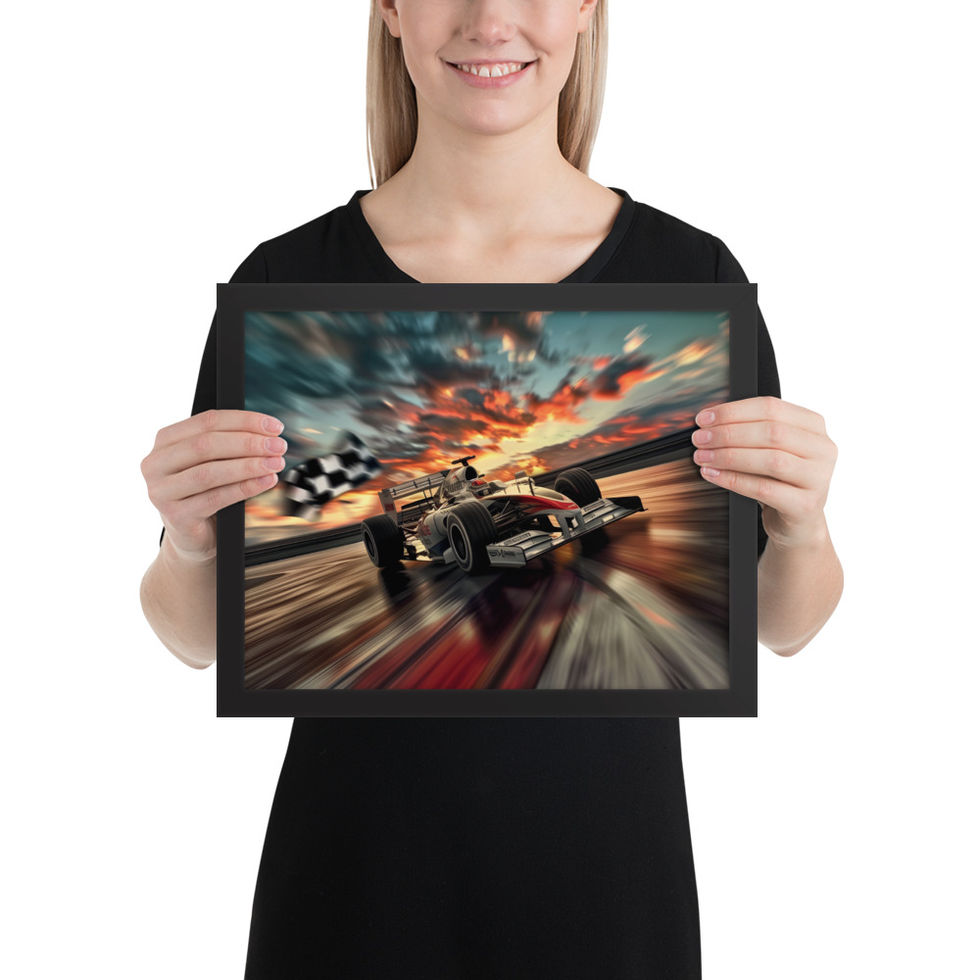 Bring the intensity of the racetrack to your walls with the "Burning Apex" framed poster. Featuring a sleek Formula 1 car speeding toward the finish line under a breathtaking sunset, with the checkered flag waving in triumph, this artwork is the perfect blend of speed, elegance, and victory. 🌅🏁