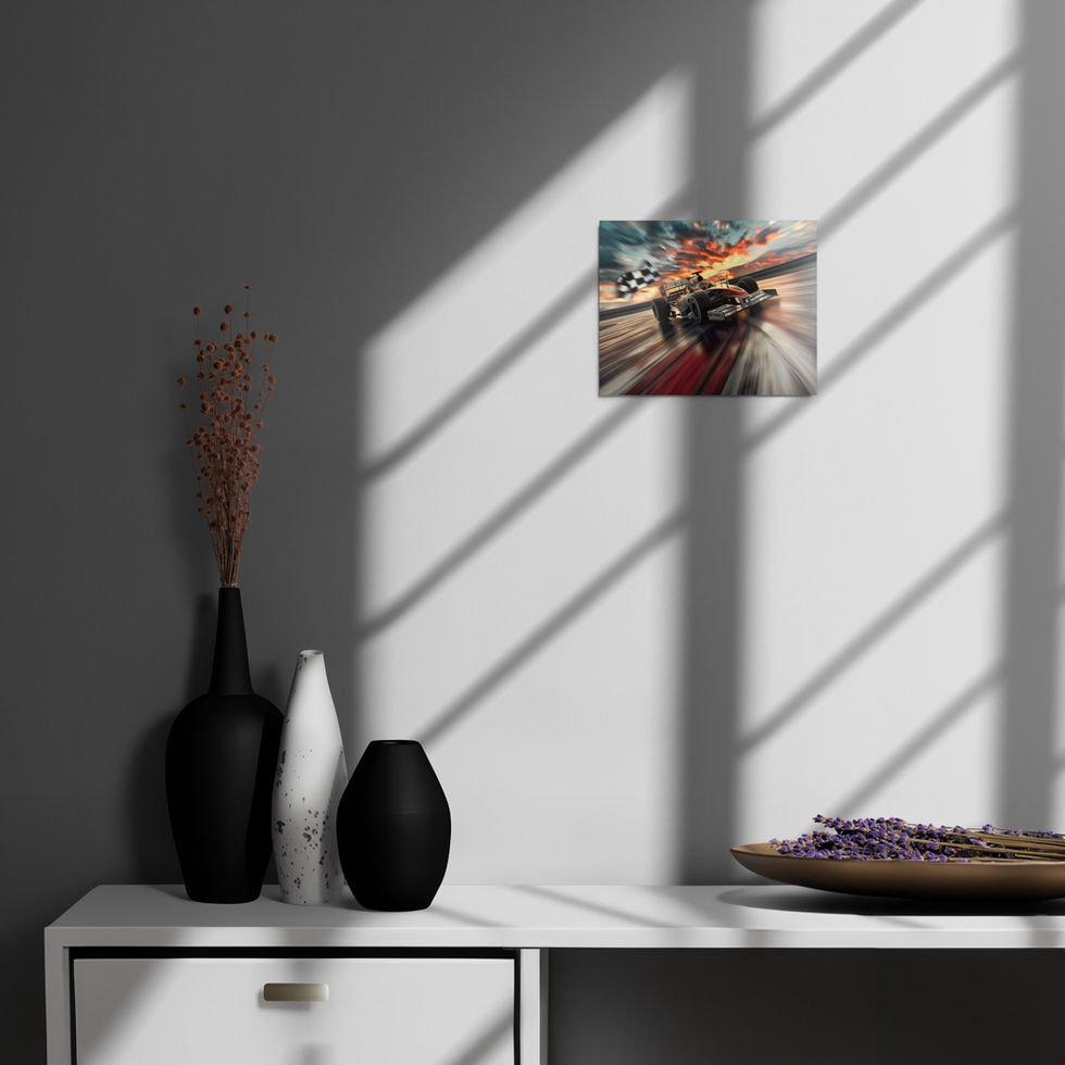 Dynamic Visuals: The motion of the F1 car paired with the dramatic sunset and iconic checkered flag creates a visually stunning and energising centrepiece 🏎️🌟.
