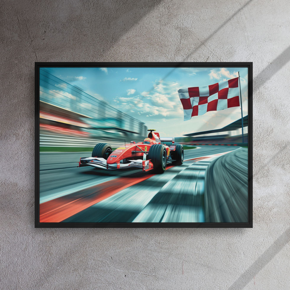 Celebrate the thrill of racing with the "F1 Grand Prix Triumph" framed canvas. Featuring a sleek red Formula 1 car tearing across the finish line with the checkered flag waving high, this artwork captures the adrenaline, precision, and victory of the ultimate motorsport. 🌟🏁