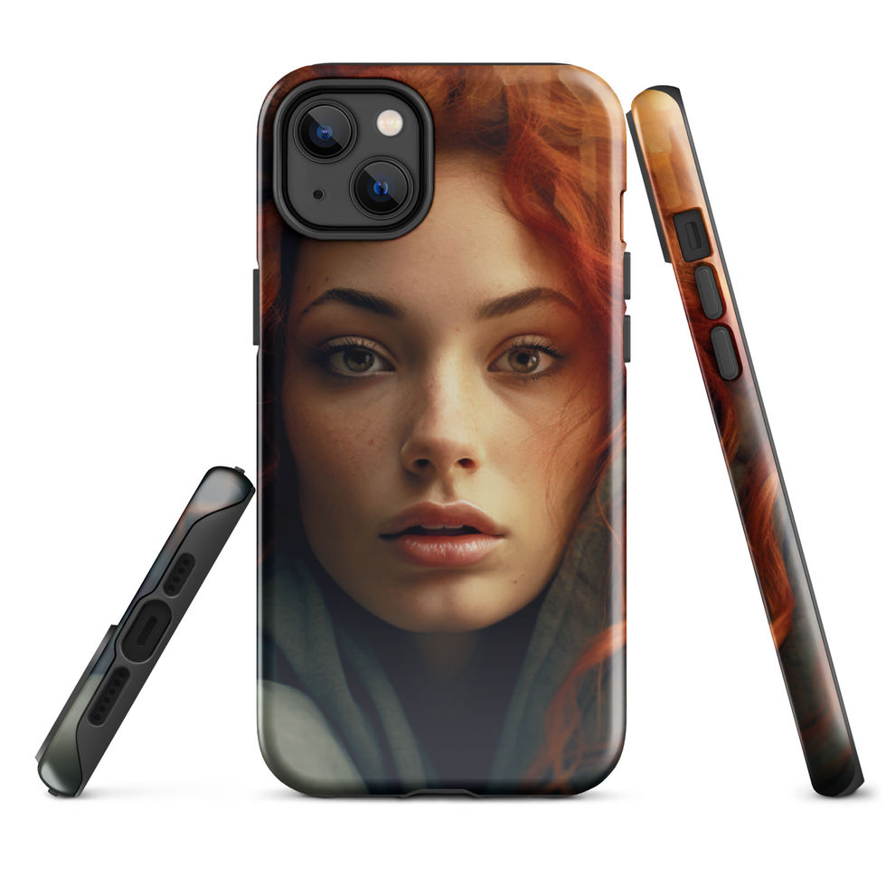 Strength and artistry collide in the "Fire & Frost" tough case. This hypnotic artwork captures a woman whose fiery hair flickers like living flames, cascading around her like a halo of embers. Her steady gaze is framed by soft shadows and abstract golden light, as if she is emerging from a dream or stepping into an alternate reality. The cool tones of her grey hood contrast beautifully with the fiery warmth of her presence, creating a visually stunning duality. This case not only protects your iPhone but transforms it into a statement piece that speaks of power, beauty, and transformation. ?????