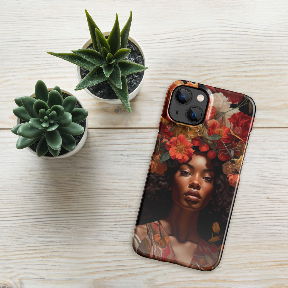 Step into a world of elegance with the Floral Majesty Snap Case. This breathtaking artwork captures a regal woman adorned with a magnificent crown of vibrant flowers. Her deep, confident gaze and flowing curls intertwined with lush roses, peonies, and blossoms create a striking fusion of natural beauty and power. A perfect case for those who embrace grace, strength, and artistry. 🎨✨