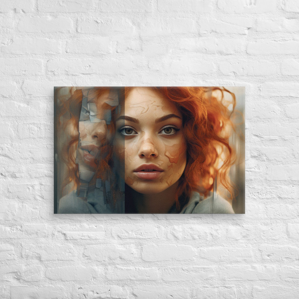 Immerse yourself in the mesmerising world of "Fractured Reflections", a captivating canvas print that blends surreal beauty with deep symbolism. This stunning artwork features a striking red-haired woman, her face fragmented like a shattered mirror, evoking themes of identity, transformation, and self-perception. The fusion of realism and abstraction makes this piece a truly unique addition to any space. 🔥🪞