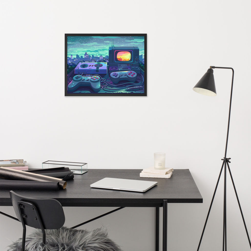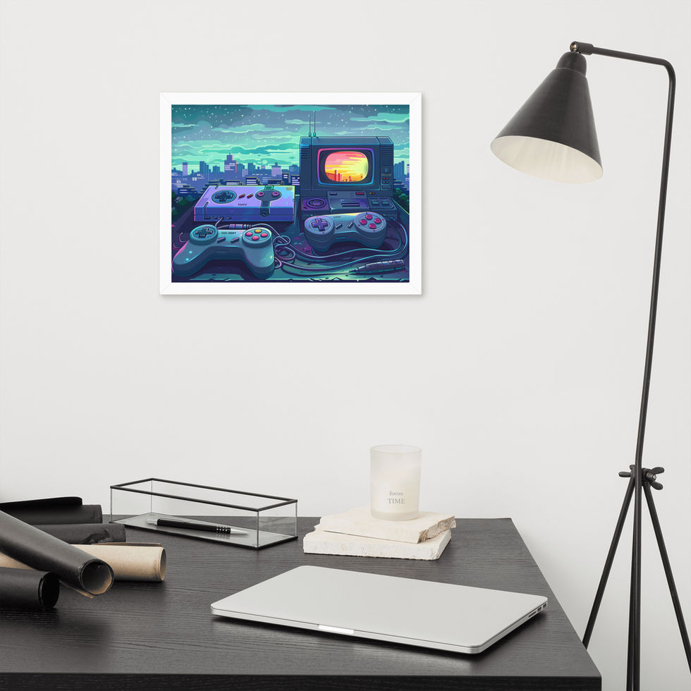 Step back in time with âRetro Pixel Memoriesâ, a framed poster that blends nostalgic gaming vibes with a dreamy neon city backdrop. Featuring classic controllers, a vintage console, and a glowing skyline, itâs the perfect piece for gamers who treasure the golden age of gaming.