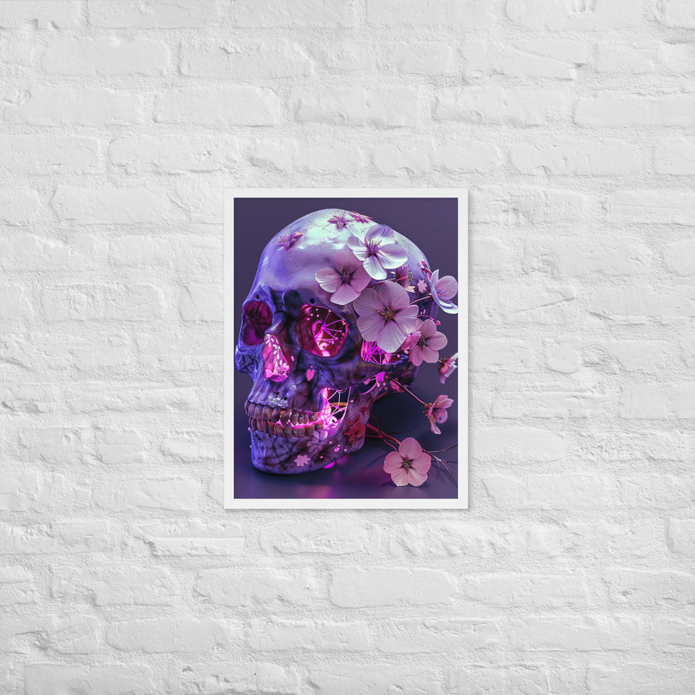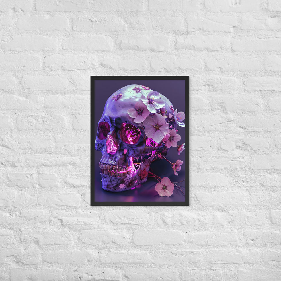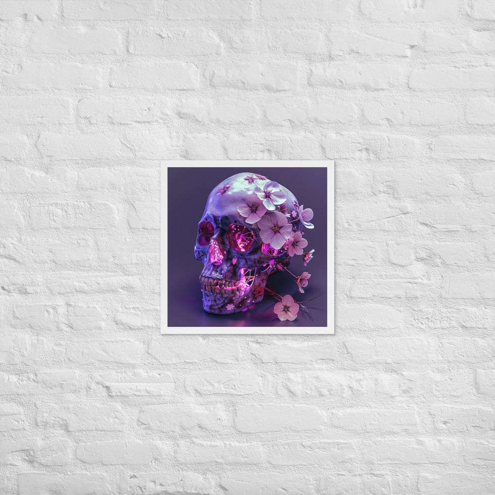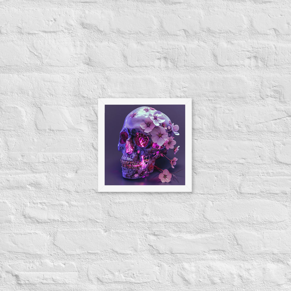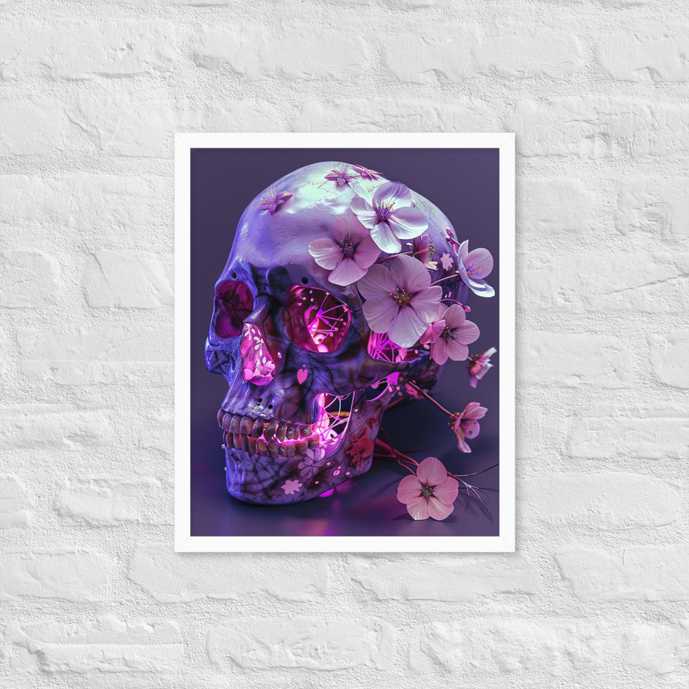 Make a bold statement with Glowing Requiem on a framed poster. A skull bathed in neon light blooms with delicate flowers, preserved within a protective frame for lasting elegance.