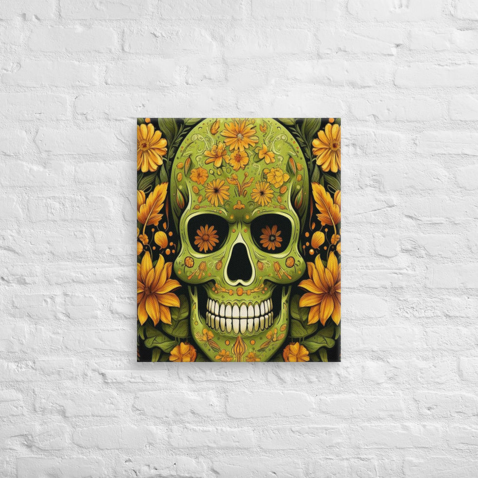 Elevate your décor with Golden Requiem on a gallery-wrapped canvas. This vibrant skull entwined with golden flowers creates a powerful and poetic statement of beauty in contrast.