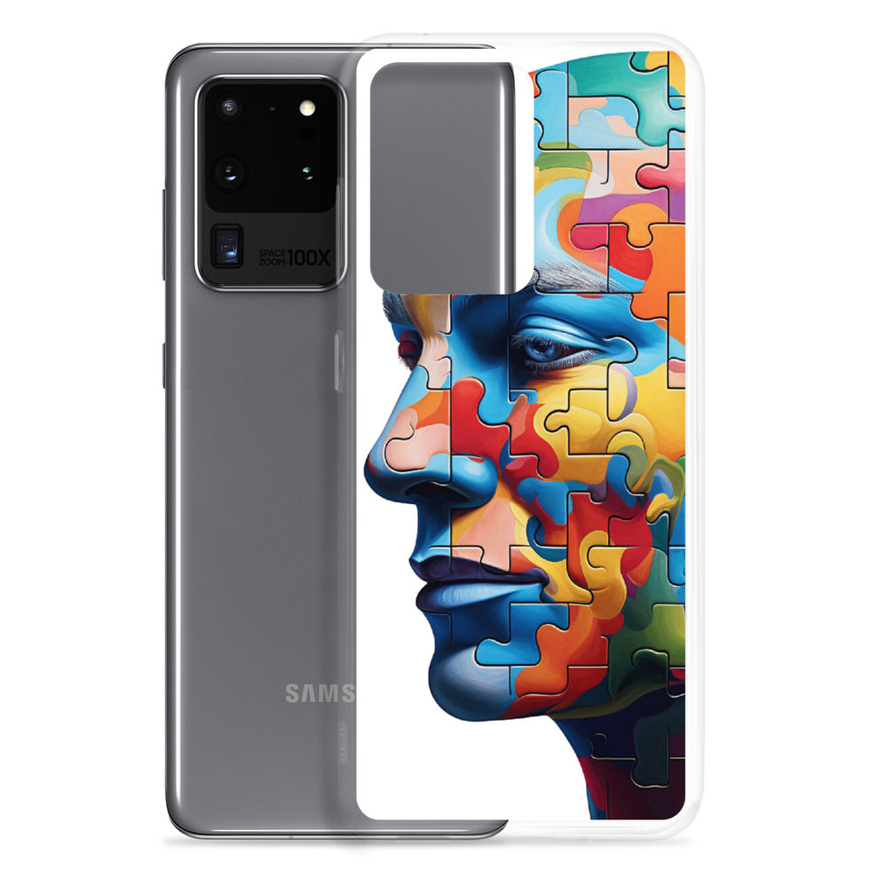 Show off your Samsung�s original design while embracing the striking visual appeal of "Mind in Pieces"! This clear case showcases a breathtaking portrait of a human face sculpted entirely from puzzle pieces, painted in a vibrant, swirling array of blue, red, yellow, and green. The sharp details and smooth gradients create a mesmerising illusion of movement, making this case a perfect combination of modern minimalism and surrealist art. The transparent background allows your phone�s natural beauty to complement the artwork, making for a sleek and sophisticated design. ?????