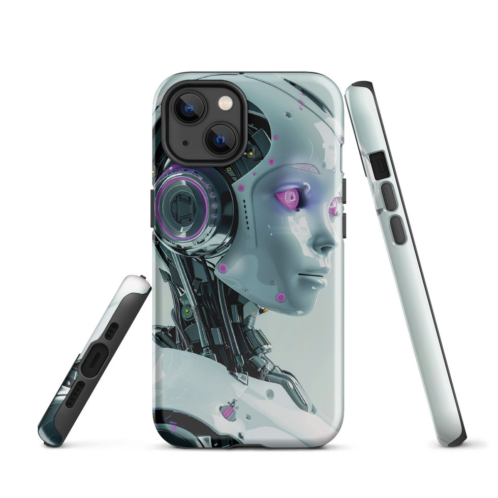 Unleash the intelligence and resilience of "Neon Cypher", an AI marvel engineered with a fusion of sleek plating and intricate cybernetic wiring. This humanoid embodies the power of artificial intelligence, featuring illuminated violet energy nodes, high-tech components, and a seamless exoskeleton. The glowing optics and advanced cybernetic framework make her a symbol of futuristic innovation. Designed with dual-layer protection, this tough case ensures your iPhone remains as durable as the AI entity it represents. ?????
