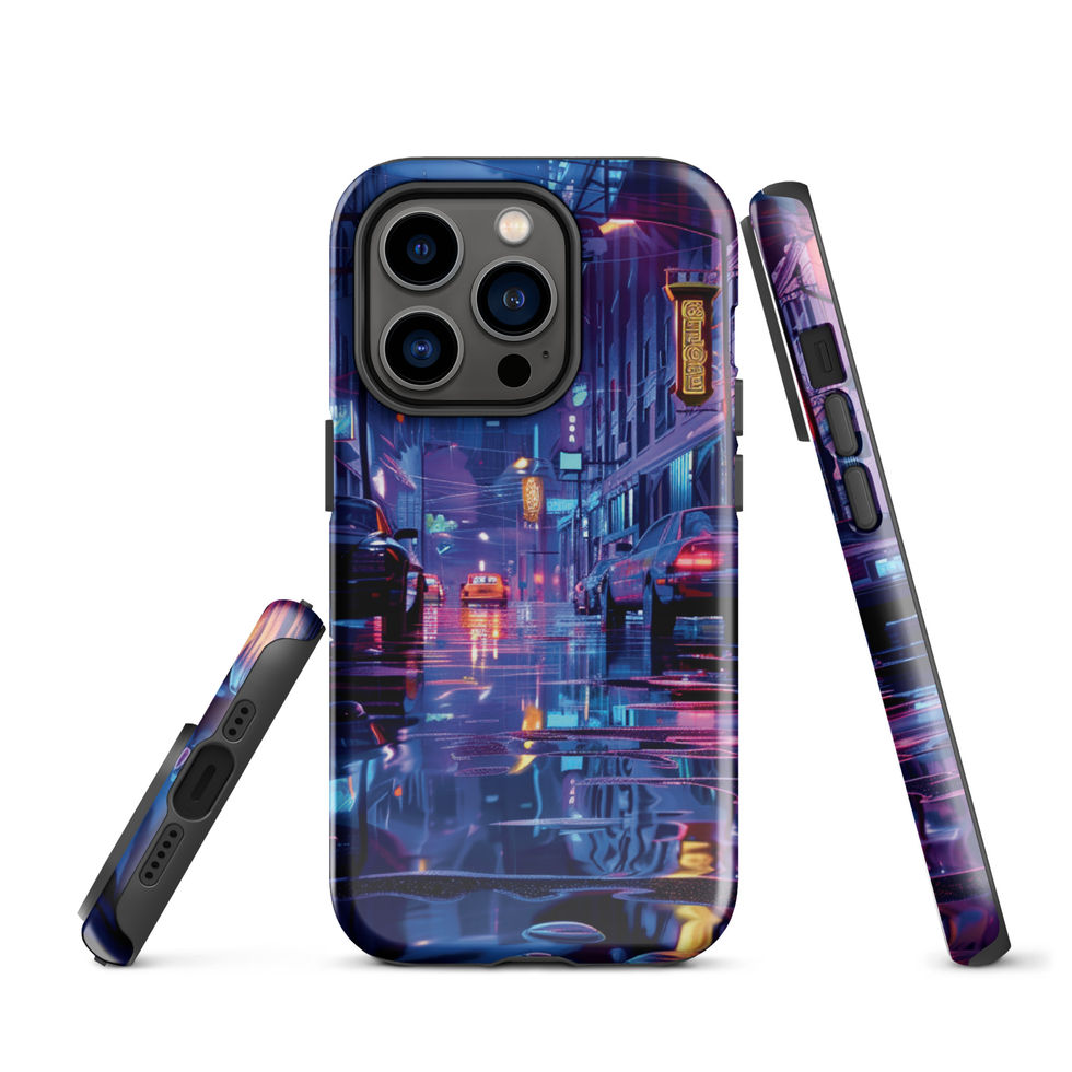 Turn your iPhone into a work of cyberpunk art with the "Neon Drifters" Tough Case! This captivating design throws you into a neon-lit street scene, where vintage cars, shimmering puddles, and towering neon signs create a cinematic vision of the future. Every detail, from the glowing reflections to the wet pavement, immerses you in an electrifying cyber-city vibe. 🚀💫🌟