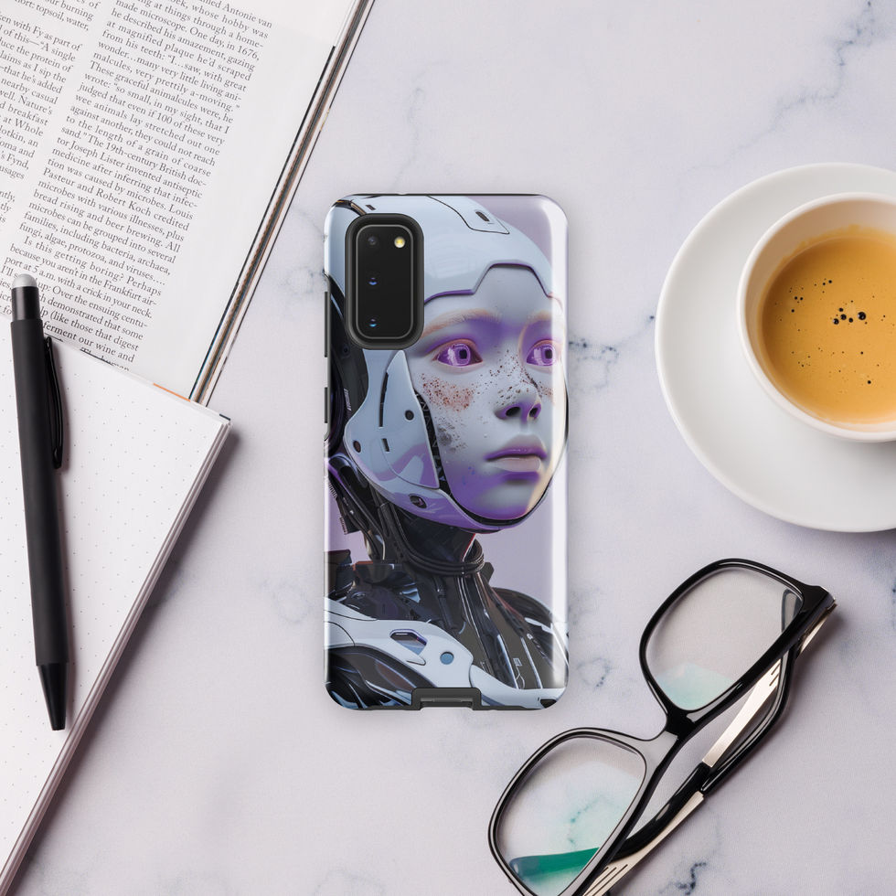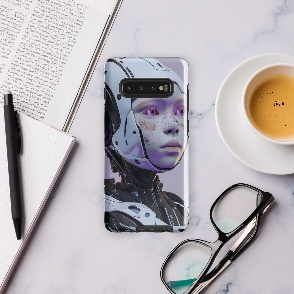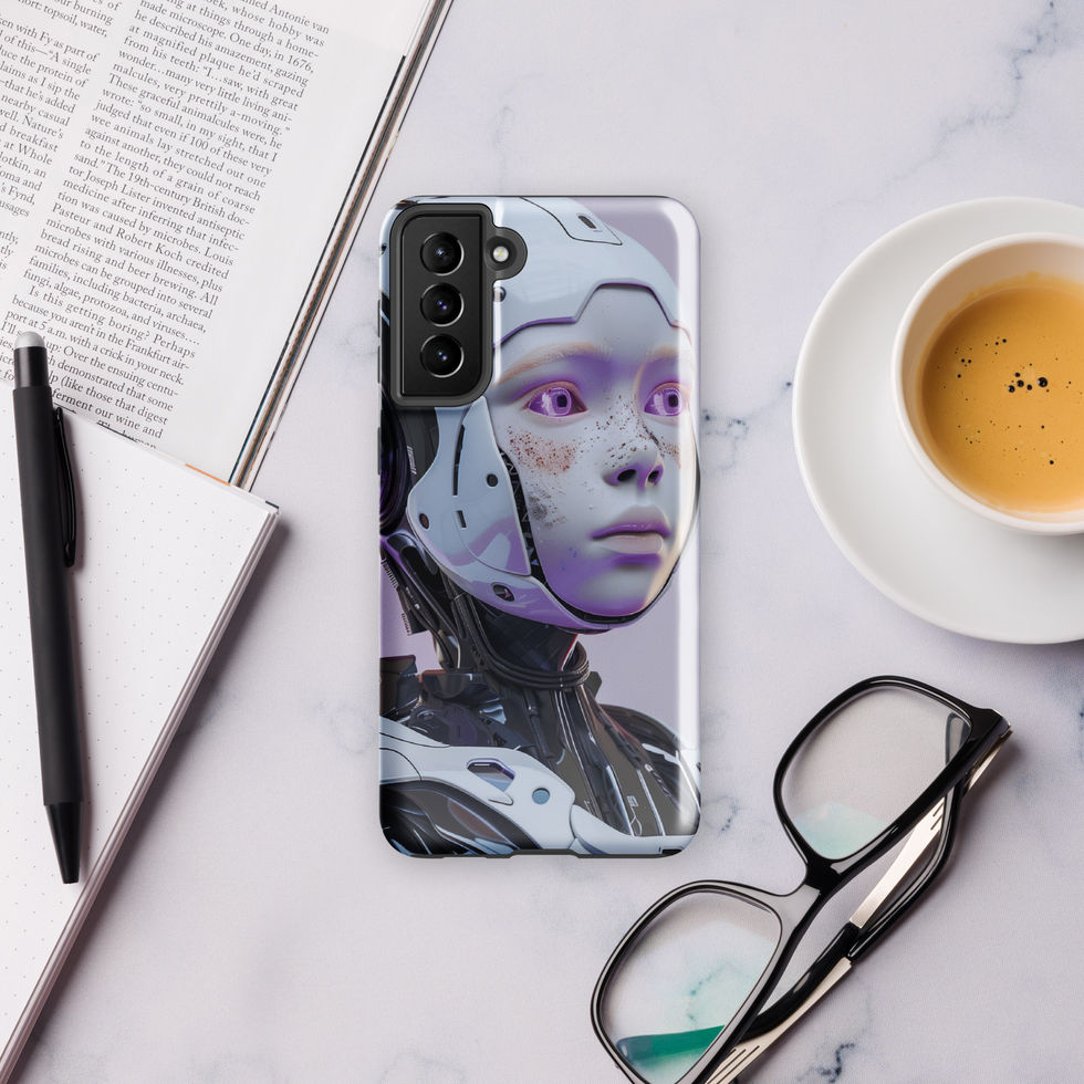 Protect your Samsung while carrying an artwork that embodies the future of AI. "Neon Prototype" showcases an advanced humanoid child with luminous violet eyes, appearing almost human with delicate freckles and smooth synthetic skin. Its elegant exoskeleton is enhanced with intricate plating, cybernetic implants, and neon circuitry that hint at a highly advanced AI consciousness. Every detail�from the microprocessors to the seamless blend of organic and mechanical textures�captures the essence of next-generation technology. ????