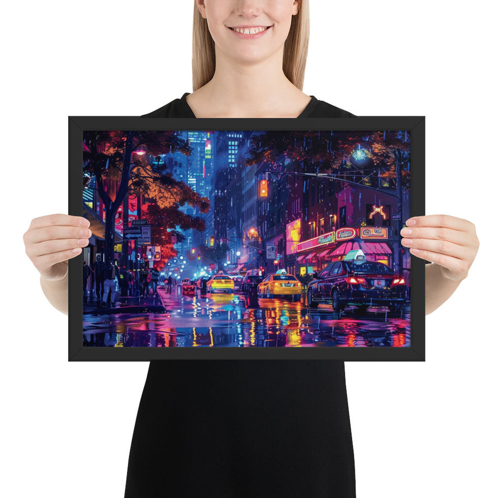 Add the vibrant energy of city life to your walls with "Neon Pulse", a framed poster that captures the magic of neon-lit streets, glowing reflections, and urban movement. Perfect for those who appreciate bold, high-energy artwork, this piece will add a contemporary touch to any space. The sleek frame enhances the artwork's depth, creating a polished and stylish display. 🚕🎆🏙️