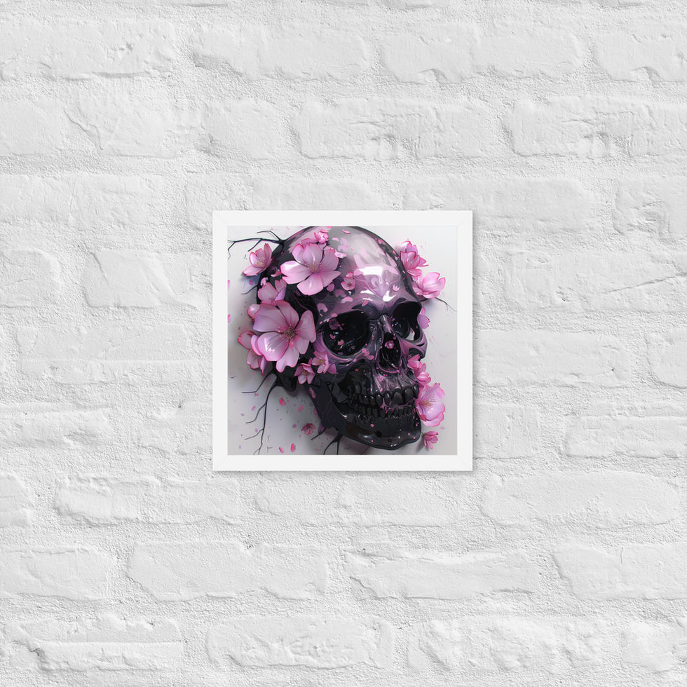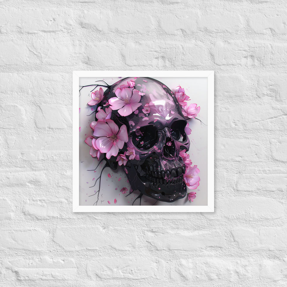 Make a bold impression with Onyx Resurrection on a framed poster. The glossy skull adorned with blossoms symbolises rebirth, shielded behind protective acrylic for lasting elegance.