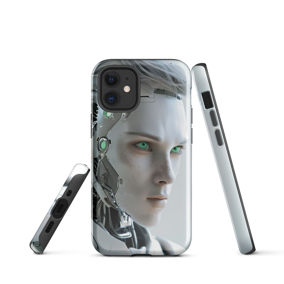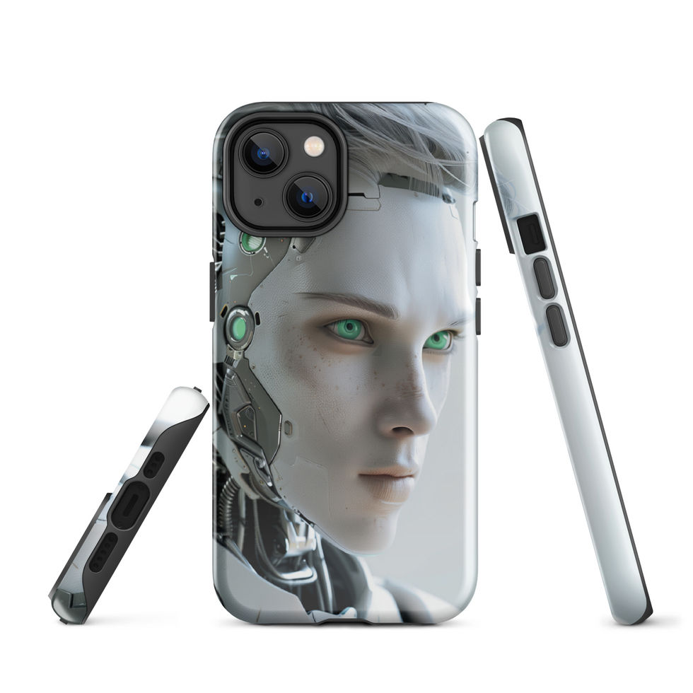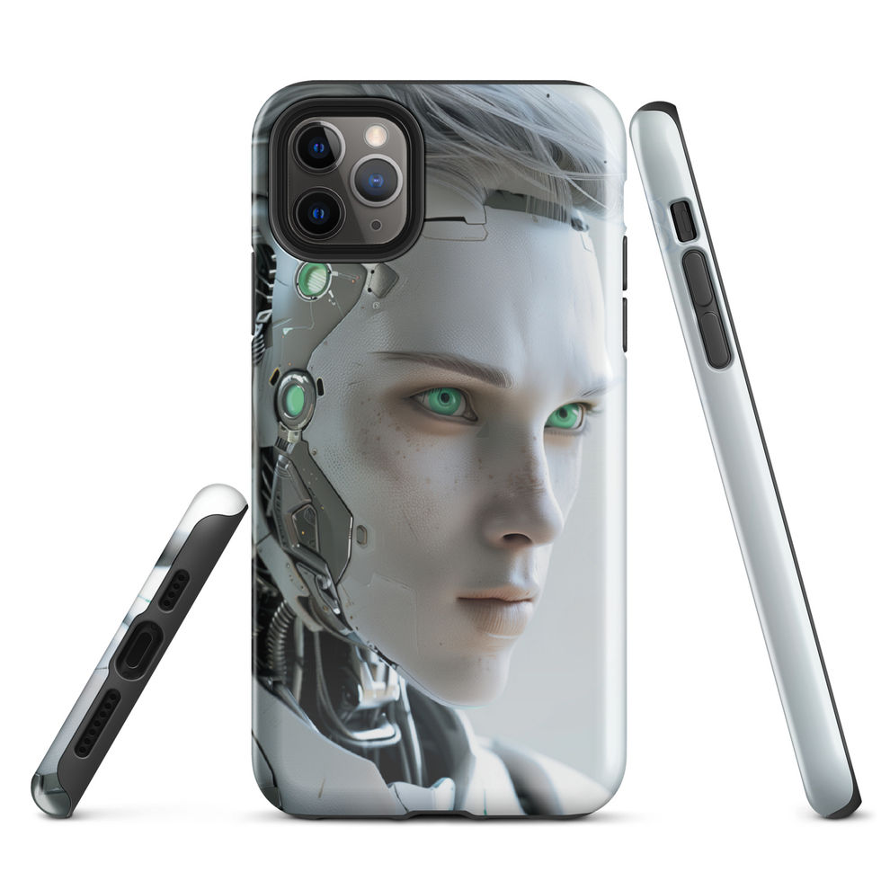 Embrace cutting-edge technology with "Quantum Guardian", a fusion of artificial intelligence and elegant cybernetics. This futuristic artwork showcases a humanoid AI with a pristine white exoskeleton, semi-organic features, and exposed circuits that pulsate with green energy. The smooth contours of its face, detailed wiring, and cyber-enhanced neural links reflect a world where machines evolve with lifelike precision. Designed for both beauty and durability, this tough case offers a dual-layer structure to keep your iPhone protected while displaying a stunning futuristic aesthetic. ?????