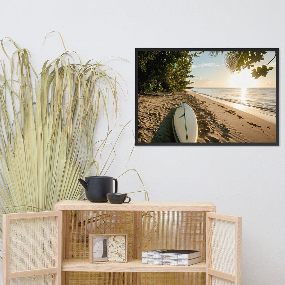 Elevate your walls with the calming beauty of the "Serene Sunset Drift" framed poster. Showcasing a paddleboard resting on golden sands beneath a radiant sunset, this artwork exudes serenity and coastal charm. 🌴🌊
