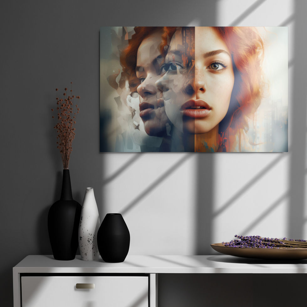 Elevate your space with "Shifting Perspectives," a striking metal print that merges realism and abstraction in a captivating visual statement. This modern masterpiece explores identity, transformation, and perception, making it a bold and thought-provoking addition to any interior.
