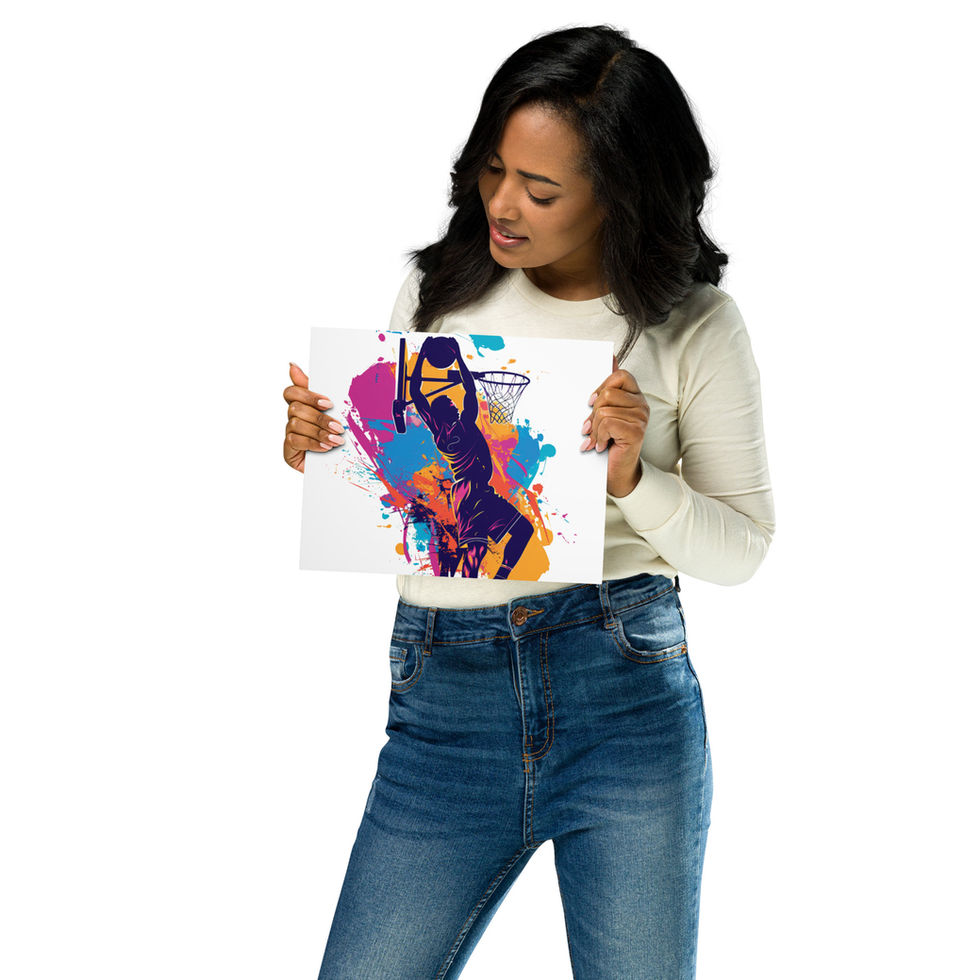 Elevate your space with the "Slam Dunk Splash" metal print, a bold and electrifying piece capturing the energy of a high-flying dunk in a vibrant explosion of colour. Perfect for basketball lovers and art enthusiasts, this sleek metal print delivers unmatched vibrancy and durability, making it an eye-catching statement piece.