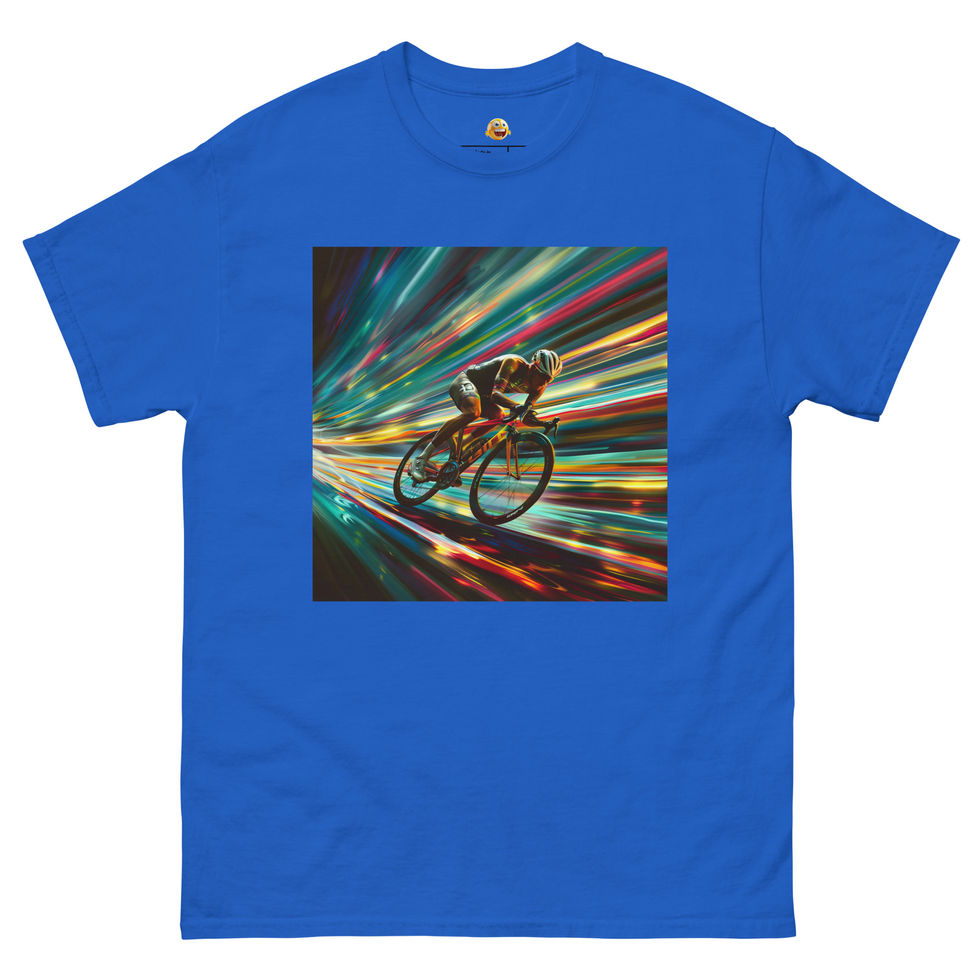 Feel the rush with the Speed Spectrum Tee, featuring a dynamic cyclist rocketing through a kaleidoscope of light and energy. This electrifying design captures speed, motion, and the thrill of racing against time.