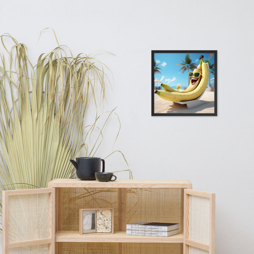 Bring some sunshine indoors with "Tropical Banana Bliss", a framed poster that captures the carefree joy of a beach day with a fun and quirky twist! Featuring a banana lounging in style, this artwork is guaranteed to brighten up any space with its playful energy.
