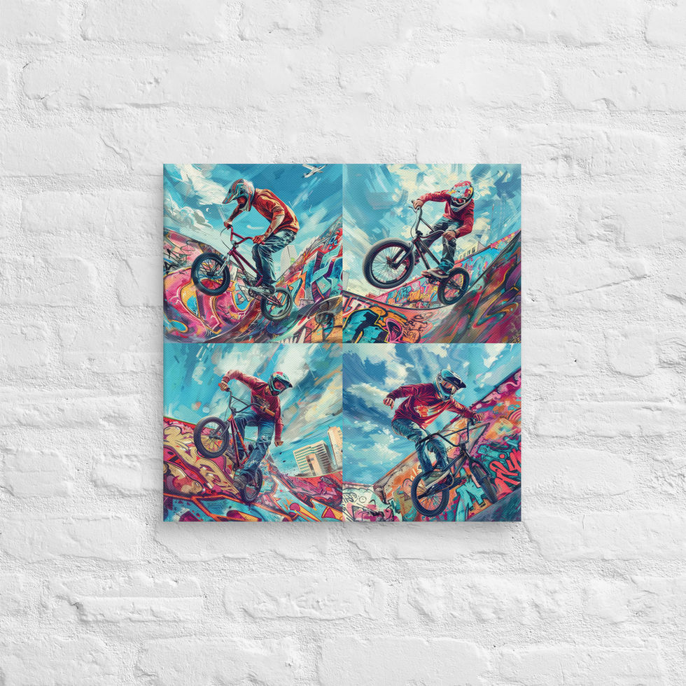 Capture the energy and excitement of extreme sports with the "Quad Neon BMX Freestyle" canvas. Featuring four high-action shots of a BMX rider executing gravity-defying stunts in a graffiti-covered skatepark, this artwork embodies the adrenaline, skill, and creativity of freestyle BMX. 🌆🔥