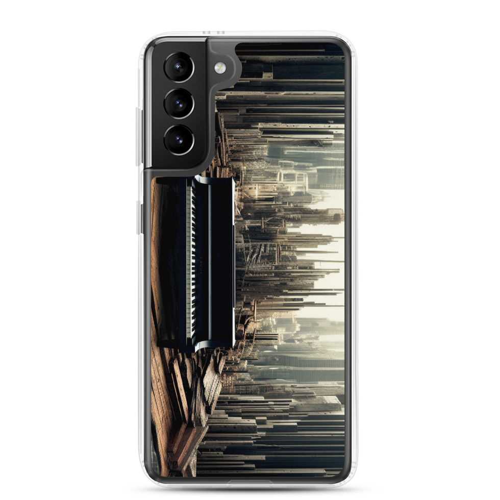 Step into a world of music and imagination with the Urban Sonata Clear Case for Samsung®! This transparent case highlights a hauntingly beautiful grand piano in the midst of a crumbling futuristic cityscape, its reflection shimmering on a fractured surface. The muted tones and striking details make this case an eye-catching yet elegant addition to your device. 🎶✨